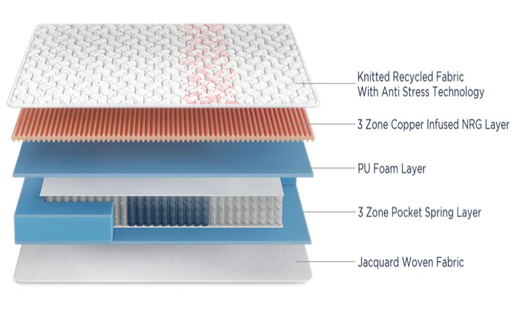 Propel is a Pocket Spring Mattress with a tight top finish. The mattress stands out for its contoured support and enhanced plushness. Our individually cased pocket springs offer zero motion transfer for undisturbed sleep. The signature 3 Zone NRG Layer provides the best zonal support and enables muscle relaxation. This layer comes with Copper-infused gel foam that draws heat away from the body for a more refreshing sleep. It also features our Anti Stress Fabric that helps you relax right, every night.